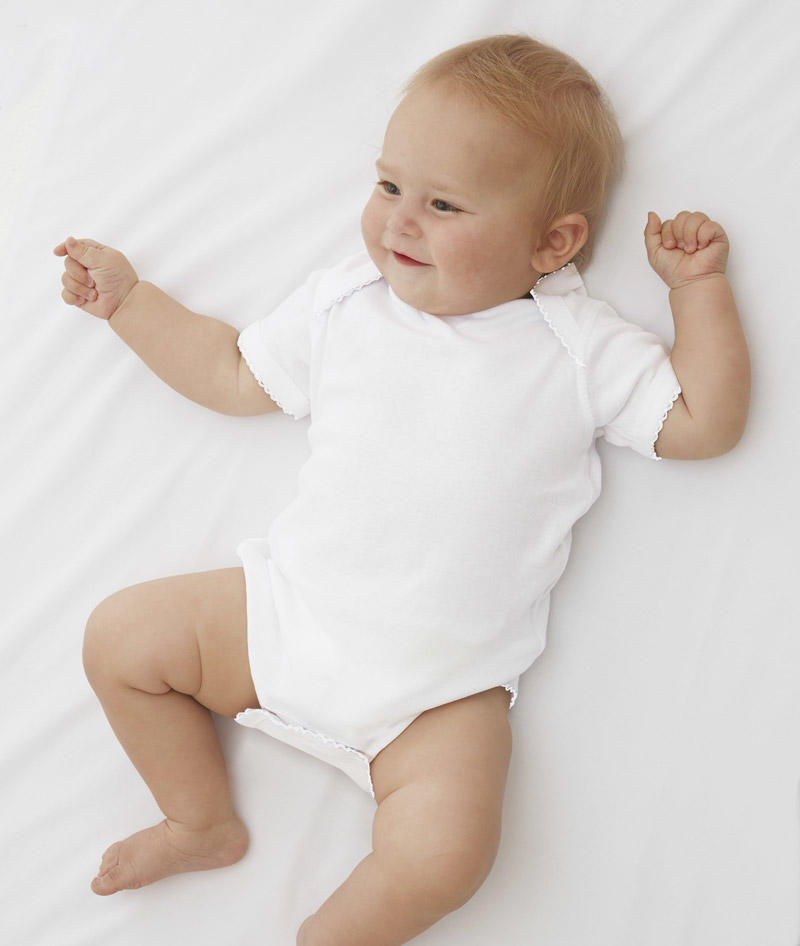 100% combed ring-spun cotton 5.0 ounce ultra soft 1x1 baby rib knit infant lap shoulder creeper. Flatlock seams. Double-needle ribbed binding on neck, shoulders, sleeves and leg openings. Reinforced three snap closure. White is sewn with 100% cotton thread.