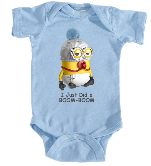The fun and loving Minions are available on baby onesie bodysuit, saying "I Just did a Boom Boom"